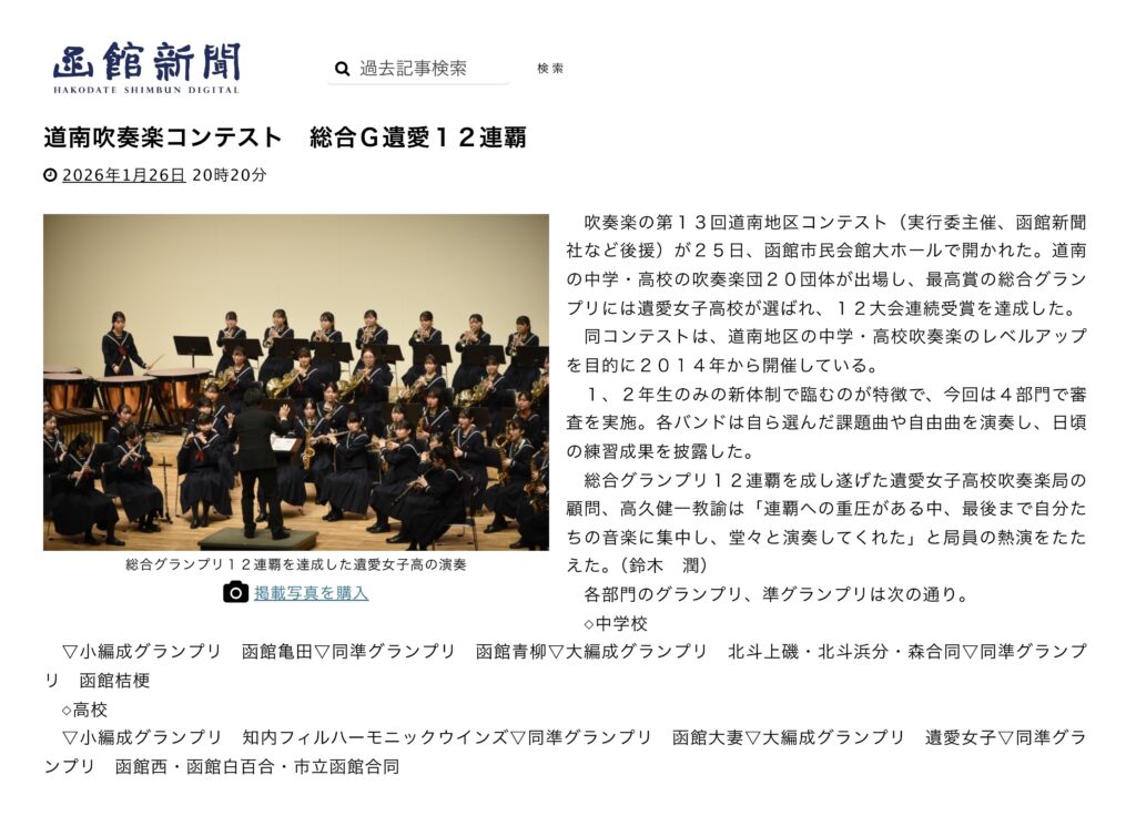 1月25日(日)函館市民会館大ホールにて開催された『第13回 道南地区吹奏楽コンテスト』において、遺愛女子高等学校吹奏楽局は、おかげさまで12年連続となる『総合グランプリを受賞』することができました。
