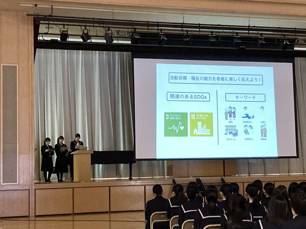 本校高校2年生による総合学習の一環として、SDGsをテーマとした発表会が体育館にて実施されました。