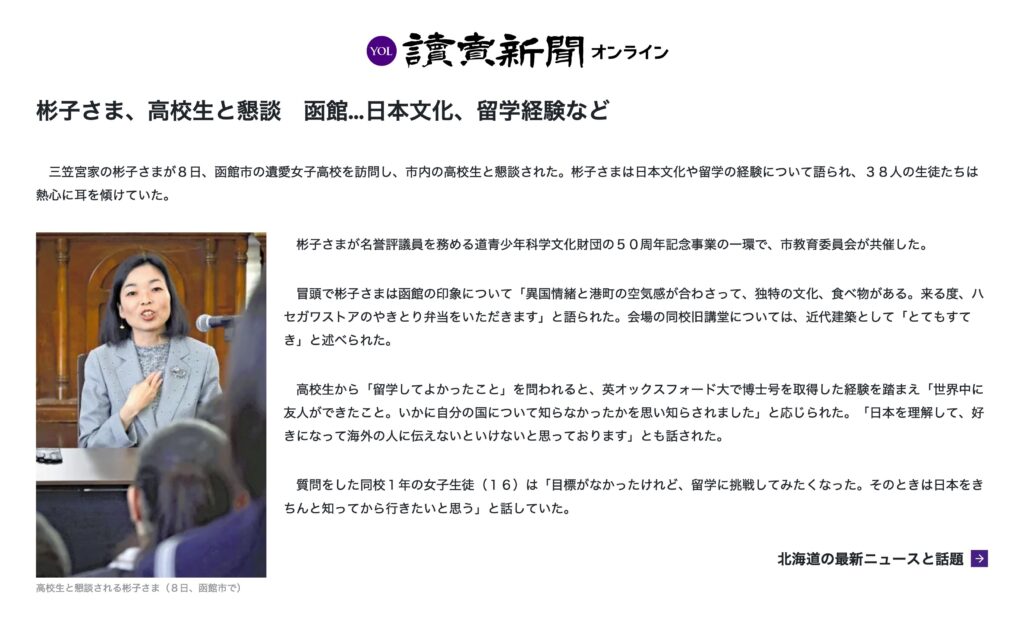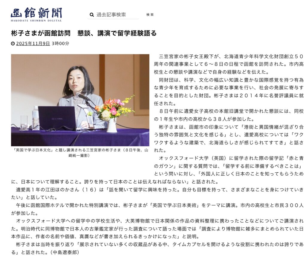 北海道青少年科学文化財団創立50周年の関連事業として、三笠宮家の彬子女王殿下が11月8日、函館市を訪問されました。午前中は遺愛女子高等学校の本館旧講堂にて、市内高校生との懇談が行われ、午後には函館国際ホテルにおいて特別講演を実施されました。