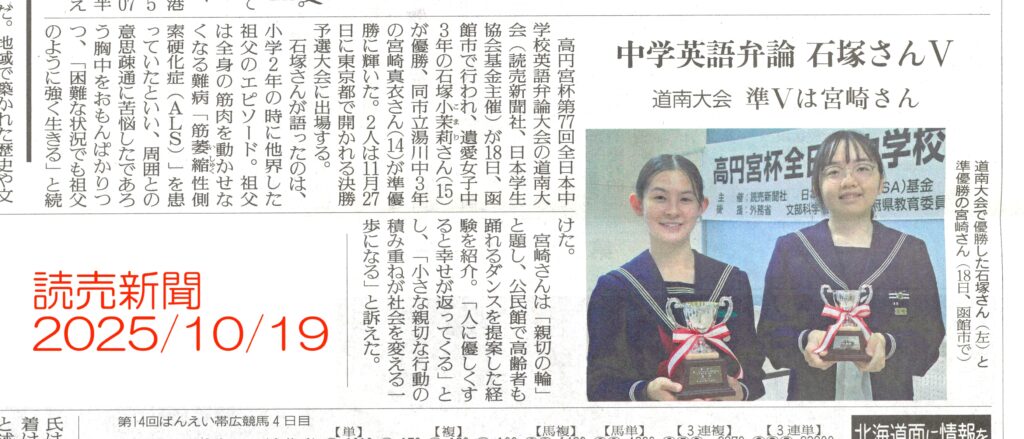 中学英語弁論大会 遺愛女子中学校 石塚小茉莉さんが『優勝』をして、全国大会に出場します!