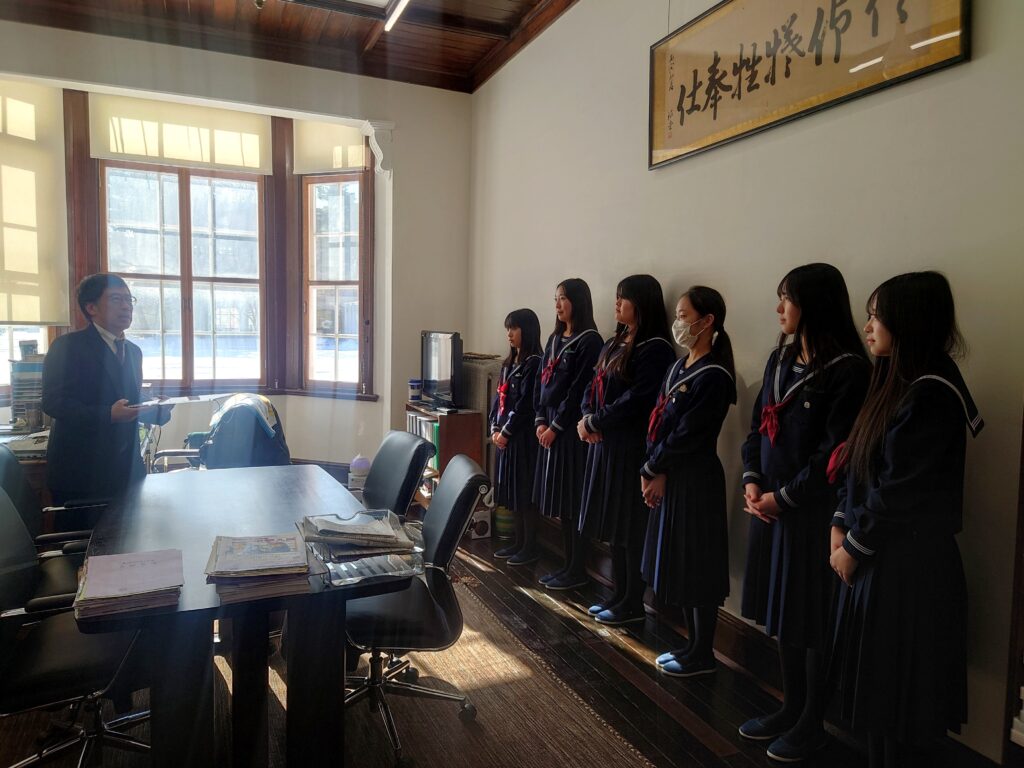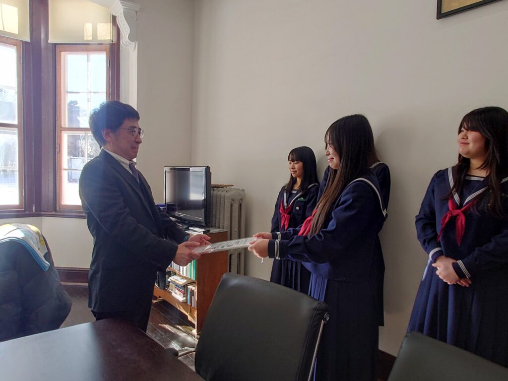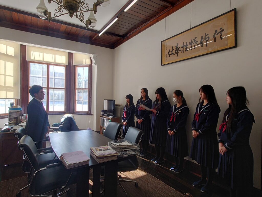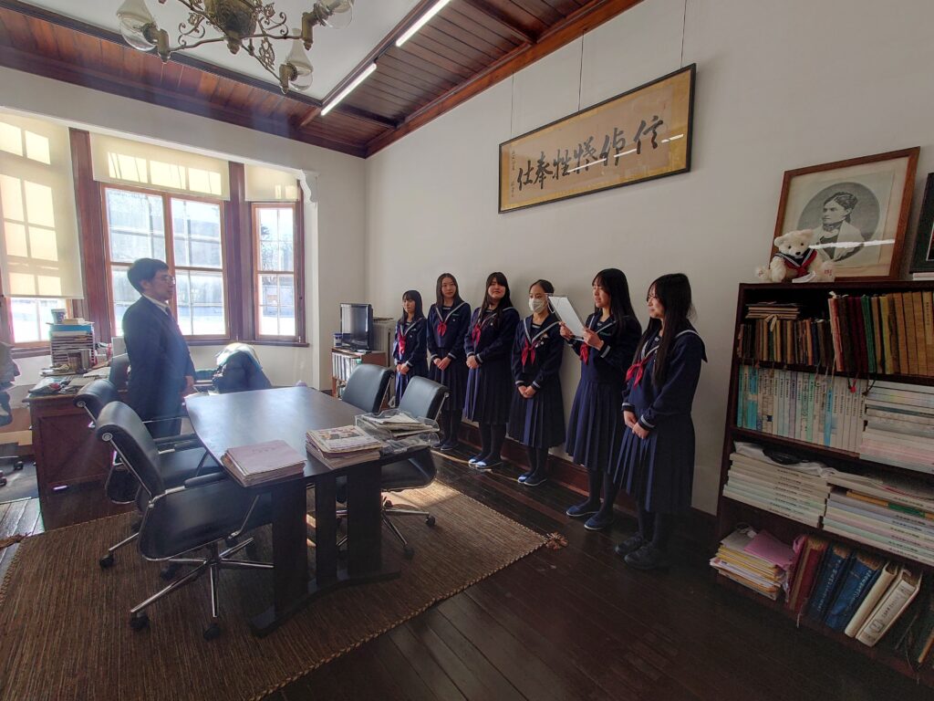 このたび、探究の集大成として高校1年生が作り上げた『SDGs 宣言書』が完成し、1月31日、校長室にて贈呈式を行いました。校長先生からは、世界が不安定な状況にある今だからこそ、皆さん一人ひとりの行動が「バタフライエフェクト」となり、社会に良い影響を広げていってほしい、大きな志をもって人生を歩んでほしい、とのお話がありました。