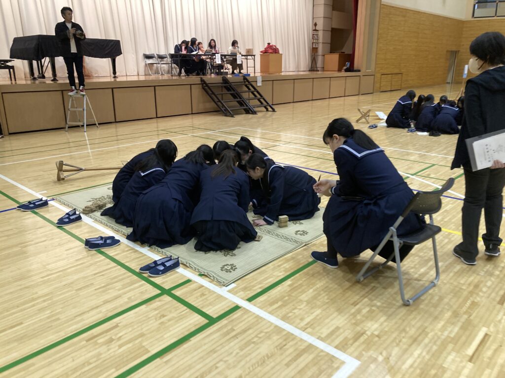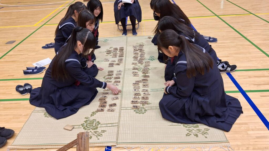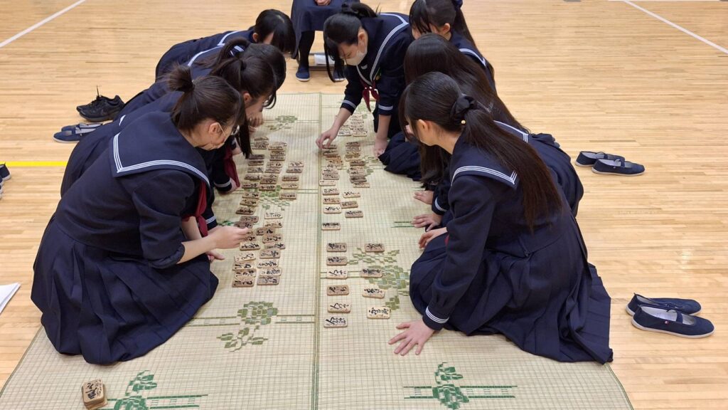 初めは木札の文字がなかなか読めなかった生徒たちも、練習を続けるうちに和歌と木札を結びつけて覚えられるようになり、試合では素早く札を取る姿が多く見られました。
